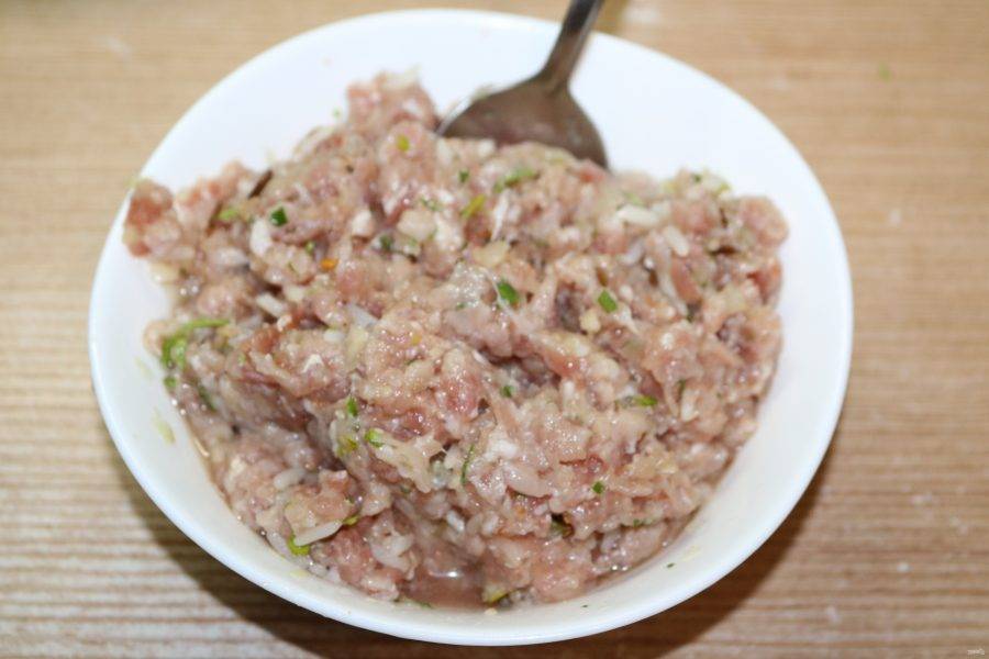 В фарш добавьте воду и хорошо перемешайте.