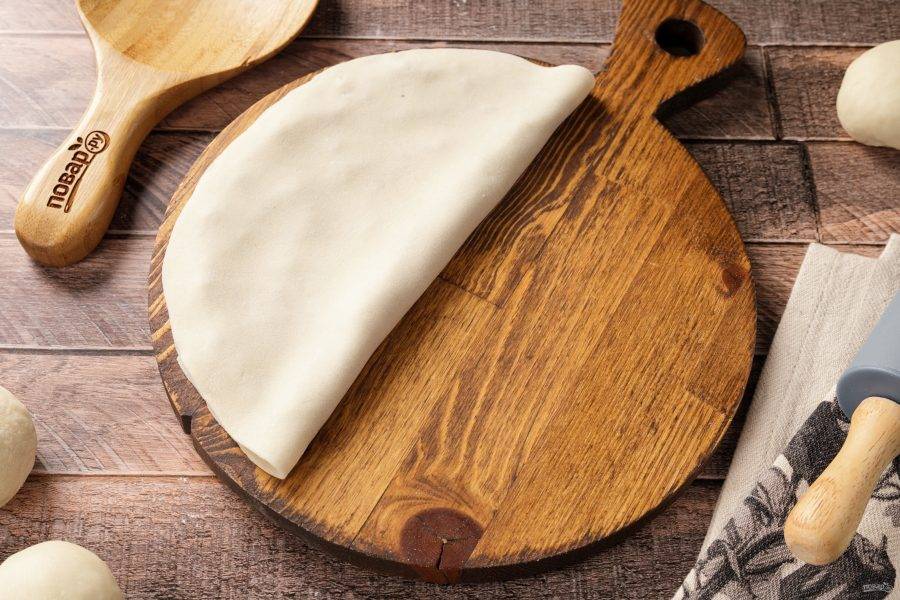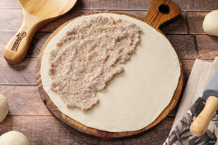 Каждый кусочек теста раскатайте в тонкий круг. На один край выложите начинку.