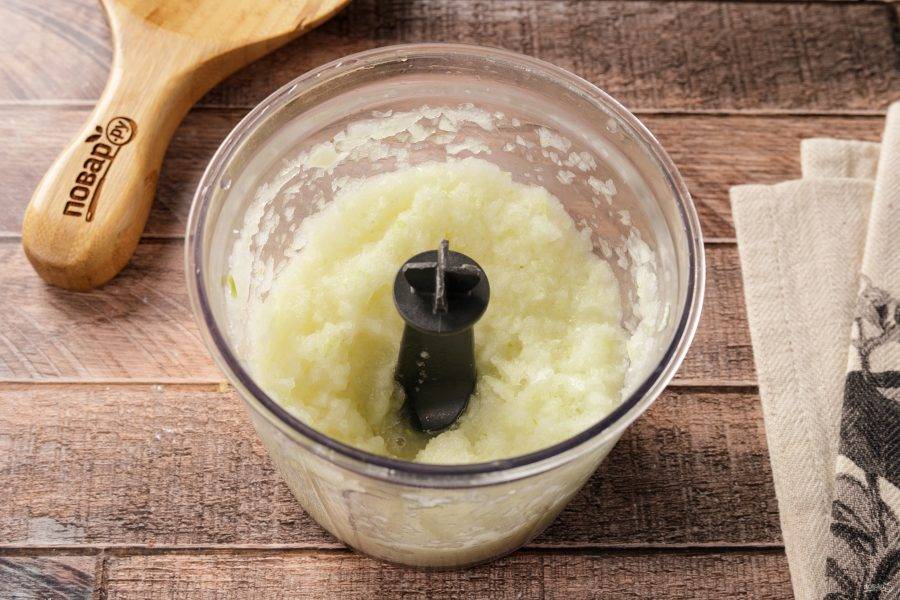 Лук измельчите в блендере или натрите на крупной тёрке.