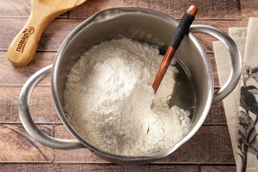 Сразу же введите муку. Можно добавить сначала 400 грамм, а затем частями ввести остальную, так как муки может уйти и чуть больше, и чуть меньше, чем указано в рецепте.