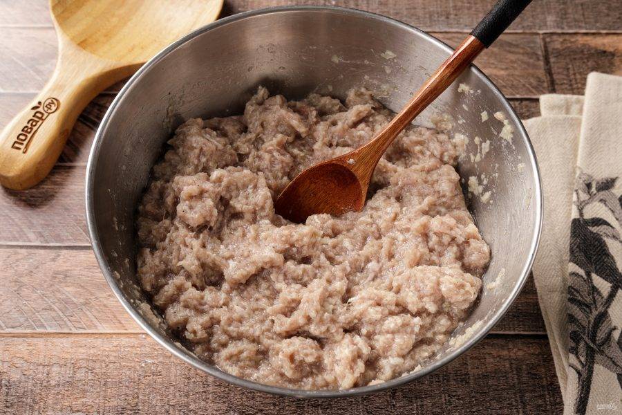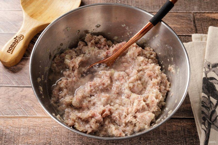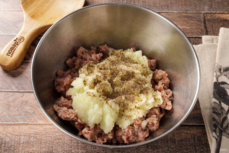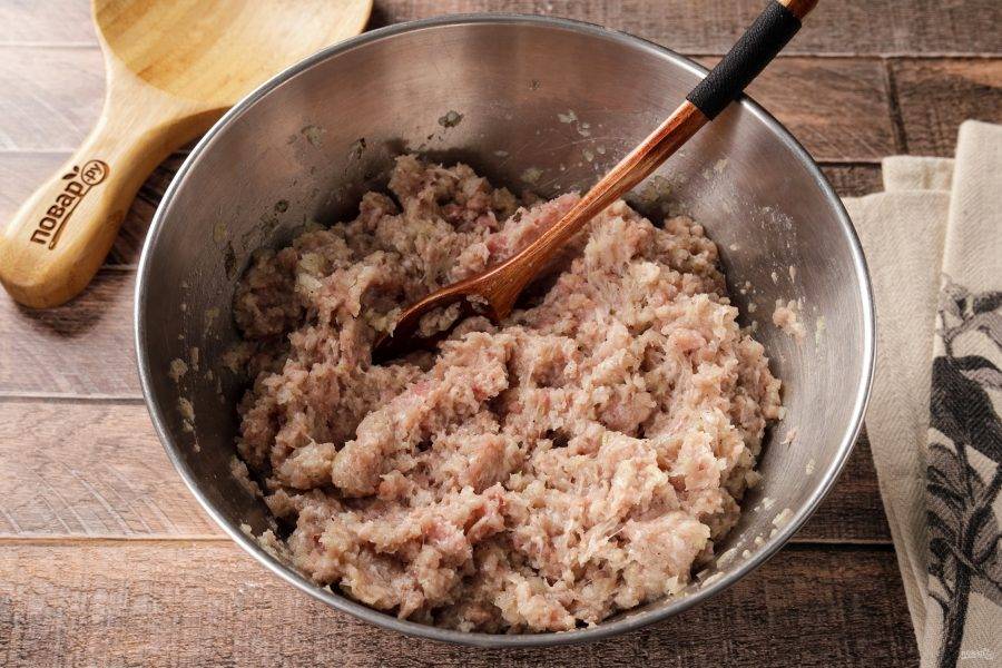 Добавьте к фаршу подготовленный лук, соль и молотый перец по вкусу.