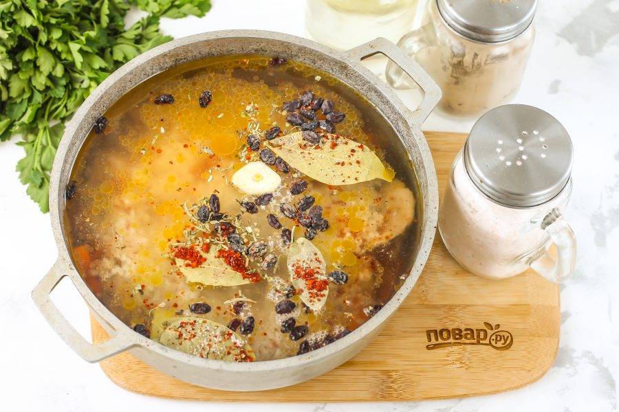 Выложите лавровые листья, всыпьте ягоды сушеного барбариса.