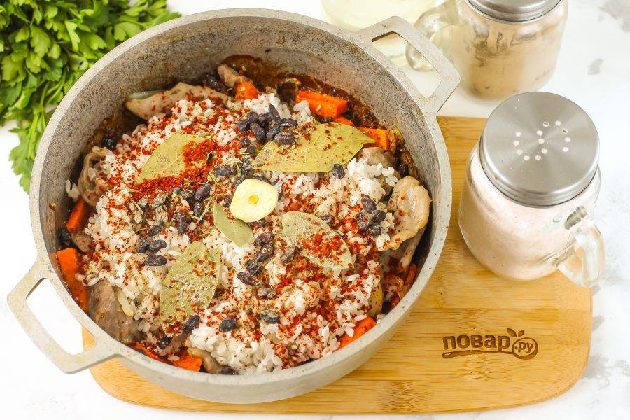 Влейте горячую воду и поместите емкость на плиту, включая умеренный нагрев. Томите около 25 минут, пока не выкипит вся жидкость. Затем нагрев выключите, а плов оставьте под крышкой еще на 10-15 минут для пропаривания.