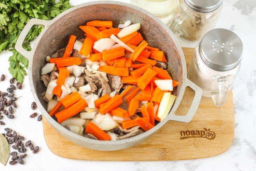 Пока мясо жарится, очистите овощи от кожуры, промойте в воде. Нарежьте морковь брусочками, а лук — полукольцами и добавьте к обжаренному мясу. Томите все на умеренном нагреве до румяности примерно 2-3 минуты.