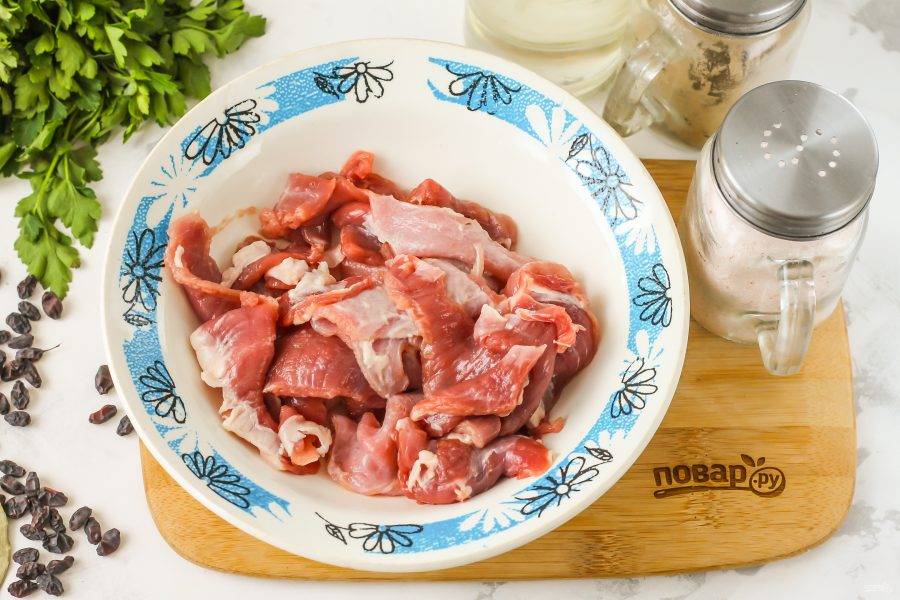 Баранину промойте в воде, мясо тщательно очистите от пленок и жил с каждой стороны, иначе они его перекрутят в процессе приготовления. Нарежьте мясо на части.