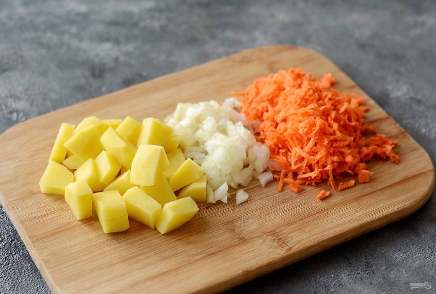 Картофель помойте, очистите, нарежьте кубиками. Морковь помойте, очистите, натрите на крупной терке. Лук нарежьте мелкими кубами. Чечевицу промойте.