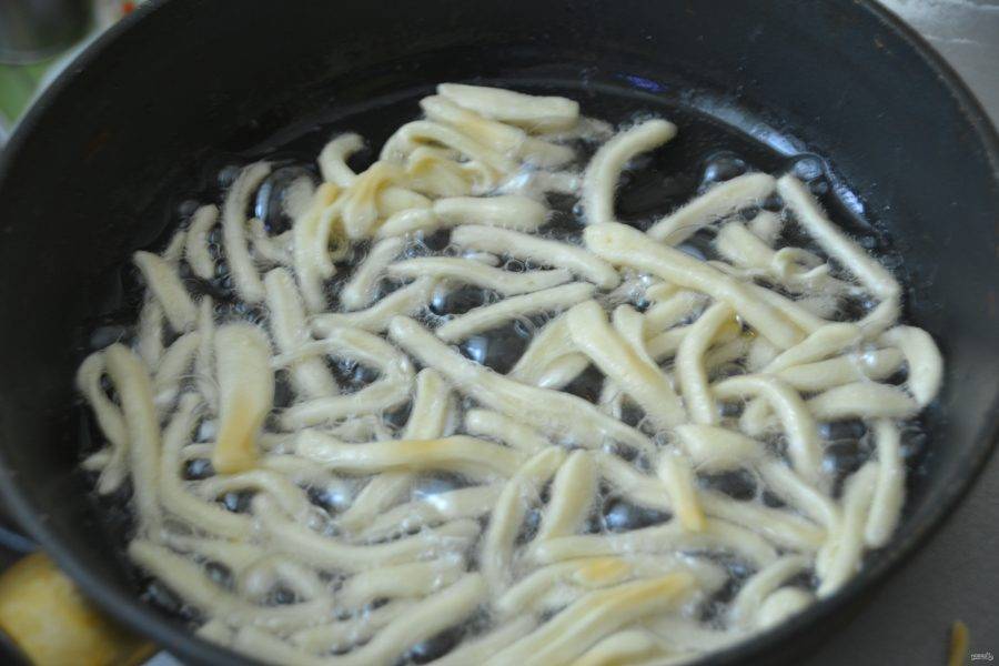 Обжаренные полоски теста выкладывайте на бумажное полотенце, чтобы впитался лишний жир.
