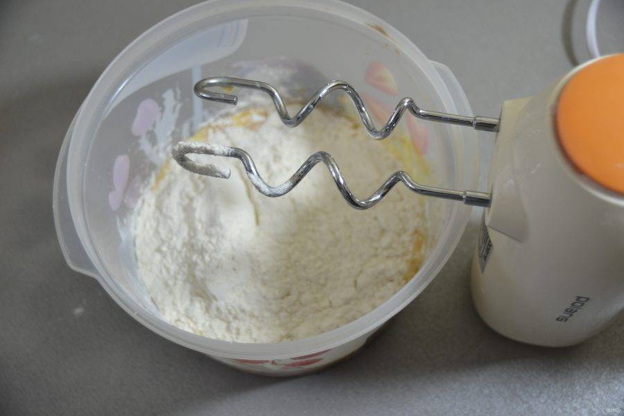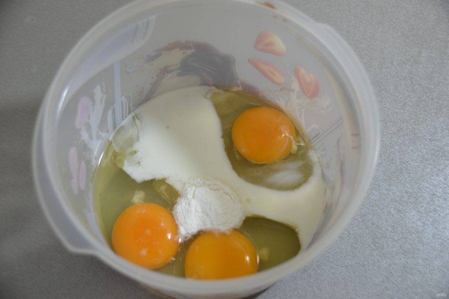 В емкость для замешивания теста вбейте яйца, добавьте молоко, соль, одну столовую ложку сахарного песка, разрыхлитель.