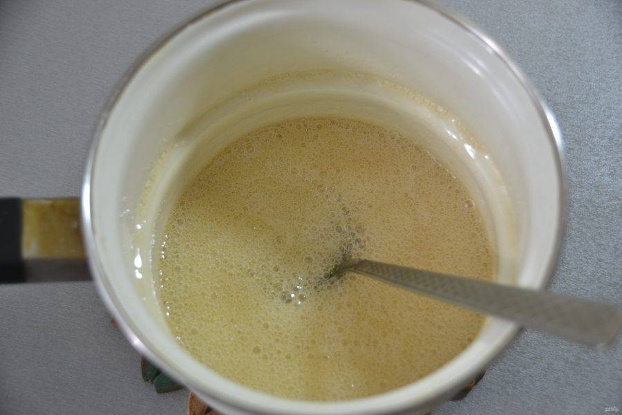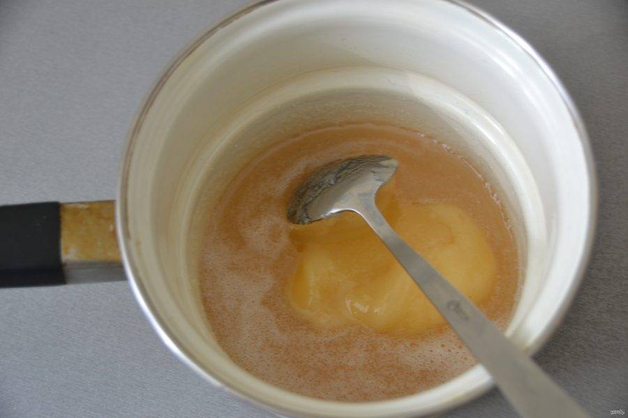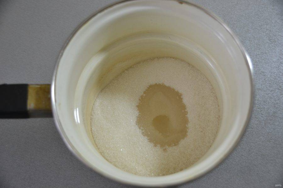 Всыпьте в ковш 150 грамм сахарного песка, влейте две столовые ложки воды, нагрейте до растворения сахара.