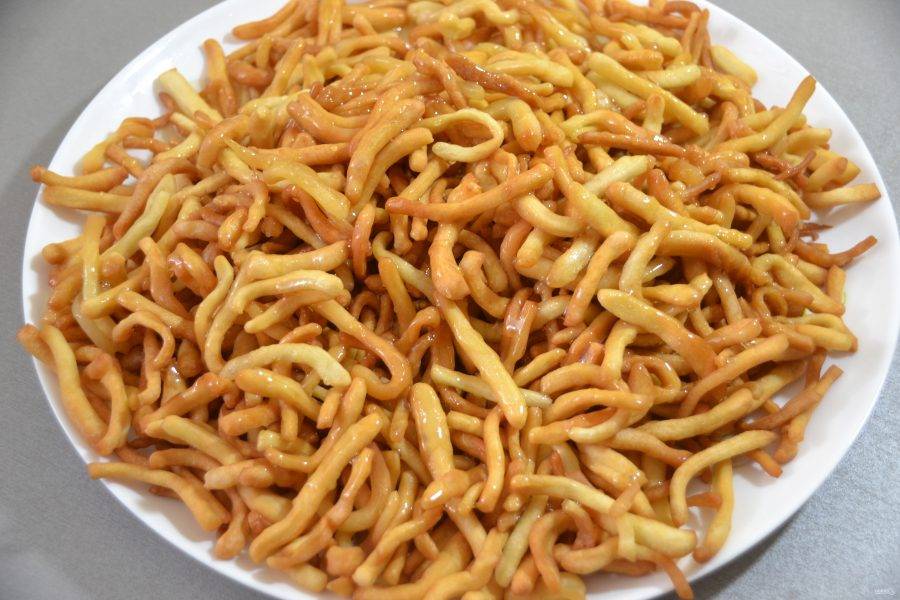 Залейте сиропом обжаренные полоски теста, затем руками перемешайте массу, желательно в перчатках, чтобы не обжечься.