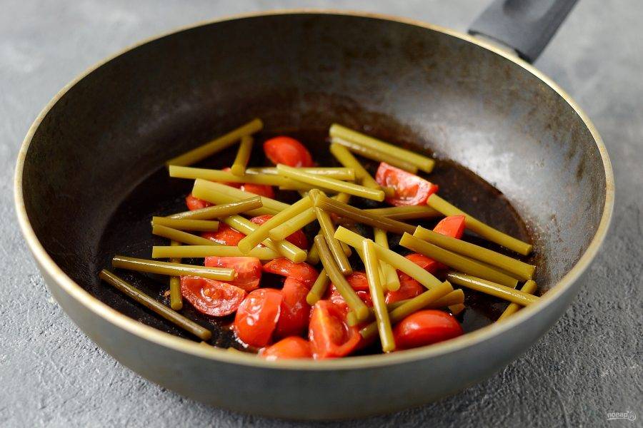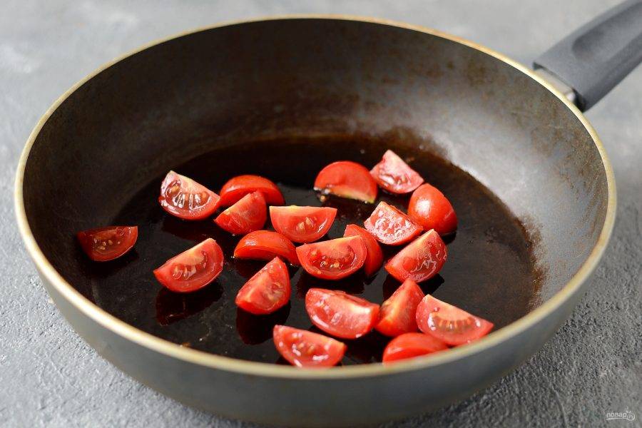Разогрейте сковороду на среднем огне. Добавьте нарезанные на четвертинки помидоры черри. Жарьте пару минут до мягкости.