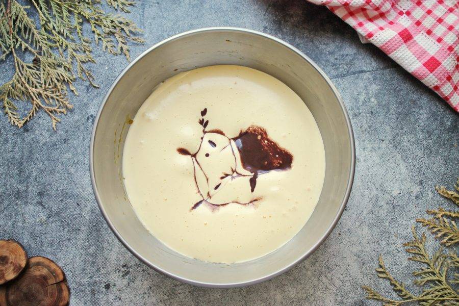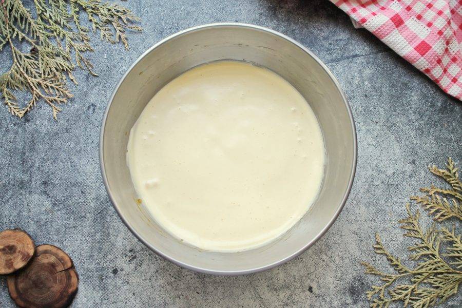 Муку соедините с разрыхлителем, просейте в яичную массу и перемешайте до однородного, без комочков тесто.
