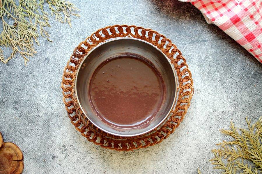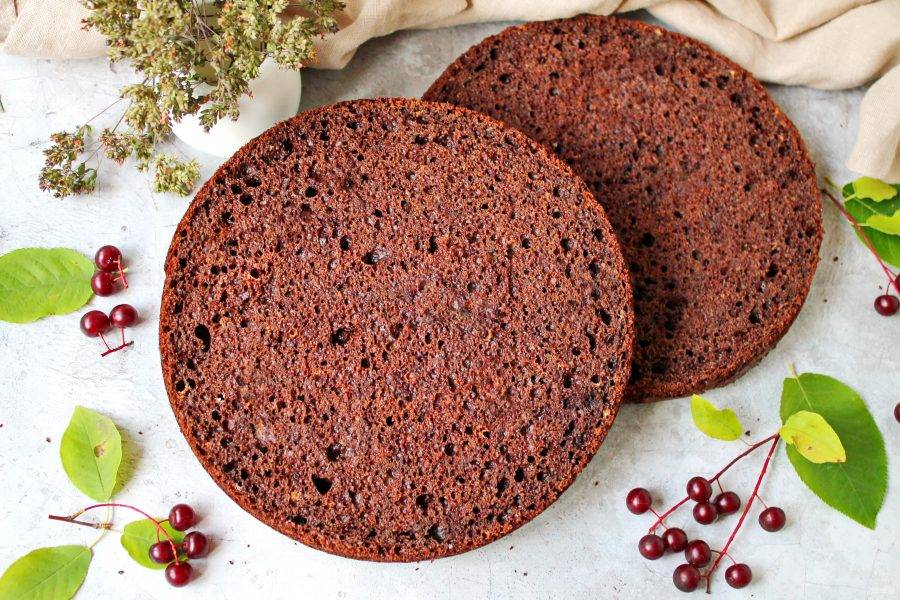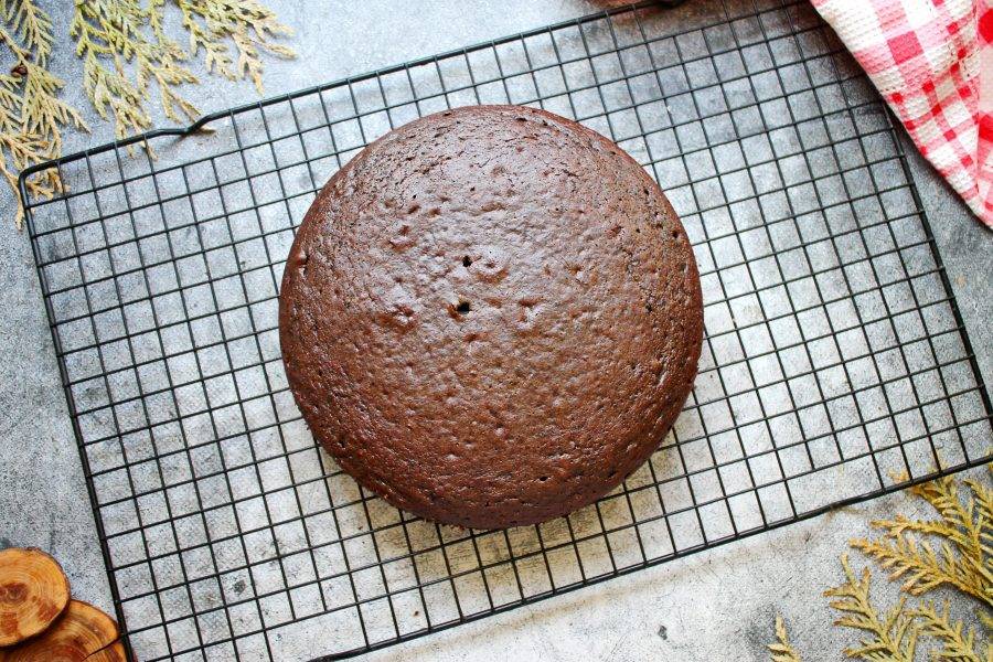 Кулинарное кольцо диаметром 18 сантиметров установите на фольгу, прижмите ее к стенкам. Застелите дно пергаментом и перелейте в форму тесто. Поставьте противень с черемуховым тестом в горячую духовку и выпекайте при температуре 180 градусов в течение 30-40 минут, до готовности. Готовый бисквит достаньте из духовки и дайте постоять 5 минут в форме. После этого переверните бисквит на решетку, удалите кольцо, пергамент и полностью остудите.