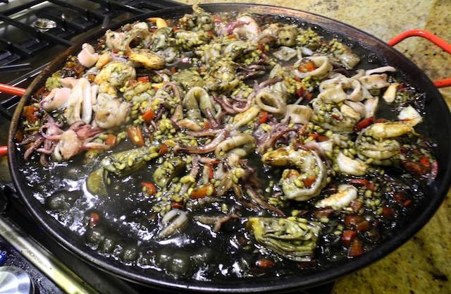 9. Выложить морепродукты и накрыть крышкой. Черная паэлья в домашних условиях может доготовиться в духовке. Перед подачей блюдо можно украсить свежей зеленью.