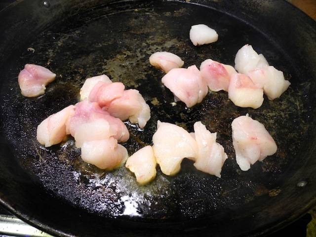 2. При необходимости добавить еще немного масла и обжарить рыбу. В рецепт приготовления черной паэльи можно использовать любую рыбу и морепродукты по вкусу.