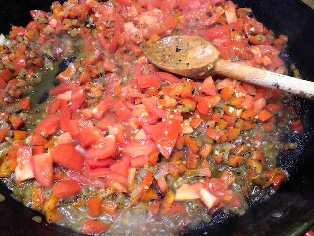 5. Тем временем нарезать небольшими кубиками помидоры и измельчить чеснок. Добавить на сковороду, обжарить пару минут.