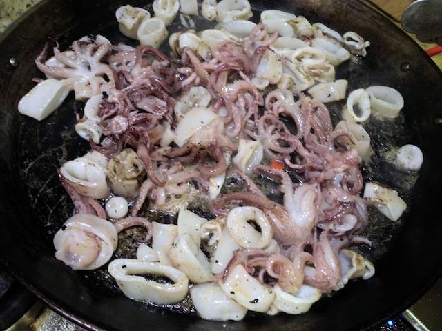 3. Также отдельно следует обжарить кальмары и другие морепродукты. На сковороде их нужно держать всего по несколько минут, чтобы морепродукты не стали жесткими.