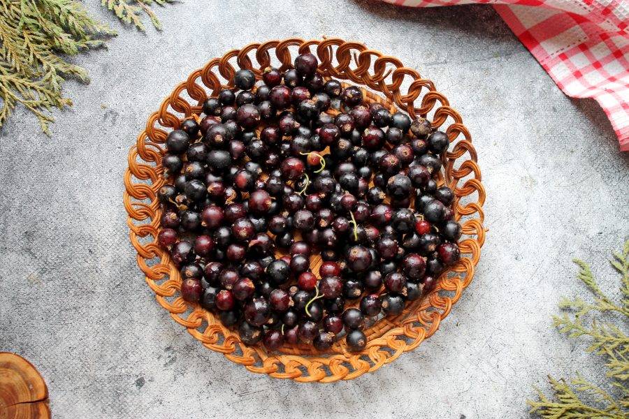 Подготовьте ягоды черной смородины, переберите, удалите мусор, веточки и испорченные.
