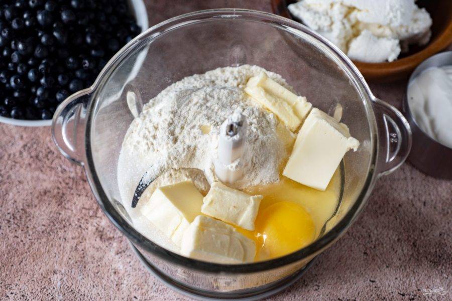 Приготовьте сначала тесто. В чашу блендера выложите муку, добавьте масло, сахар, вбейте яйца.