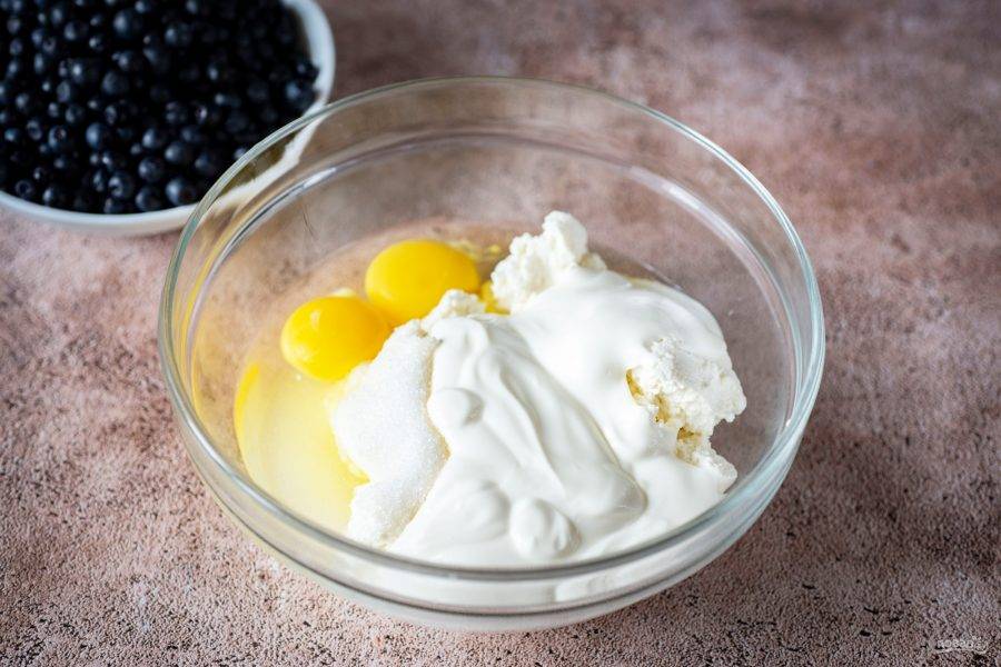 За это время приготовьте начинку для пирога. В просторную миску выложите творог, сметану, вбейте яйца, добавьте сахар, ванилин.