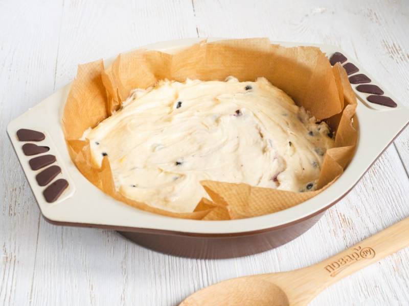 Форму для выпечки (22 см.) застелите пергаментом и выложите тесто. Поставьте выпекаться в разогретую до 180 градусов духовку на 10 минут, чтобы тесто немного поднялось и схватилось.