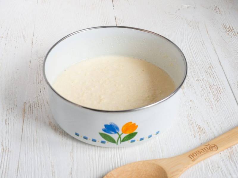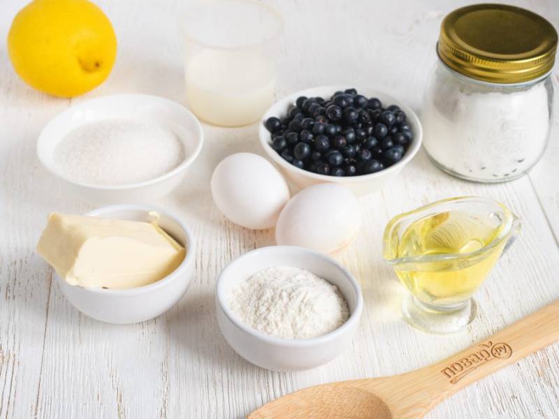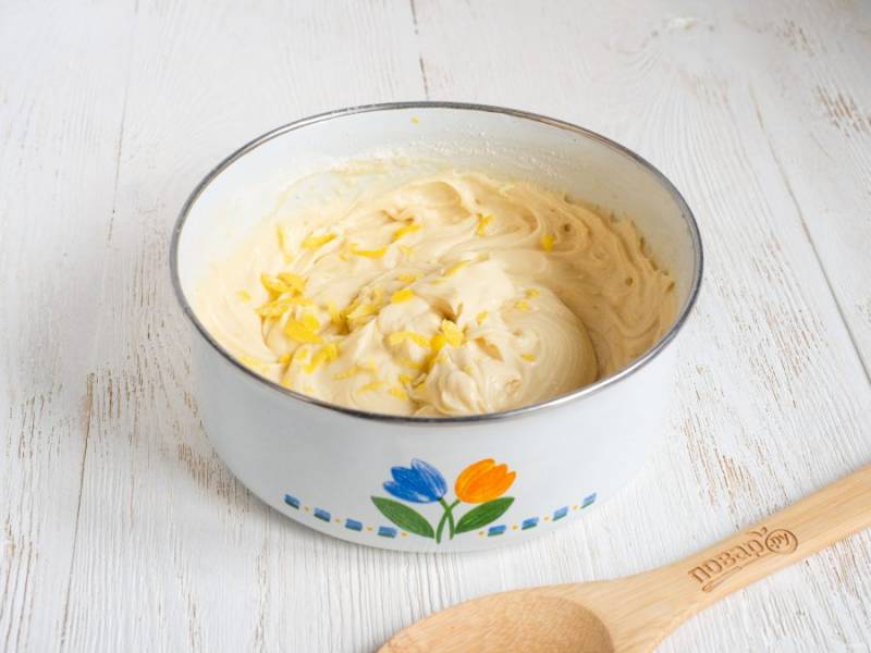 Муку смешайте с разрыхлителем, просейте и добавьте щепотку соли. Введите сухую смесь в мокрую и приготовьте тесто. Консистенция теста — густая сметана. Добавьте цедру лимона и перемешайте.