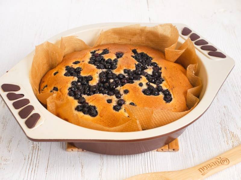 Затем достаньте из духовки и выложите сверху оставшиеся ягоды, можете немного придавить ложкой. Снова ставим в духовку и выпекаем пирог до готовности 25-30 минут.