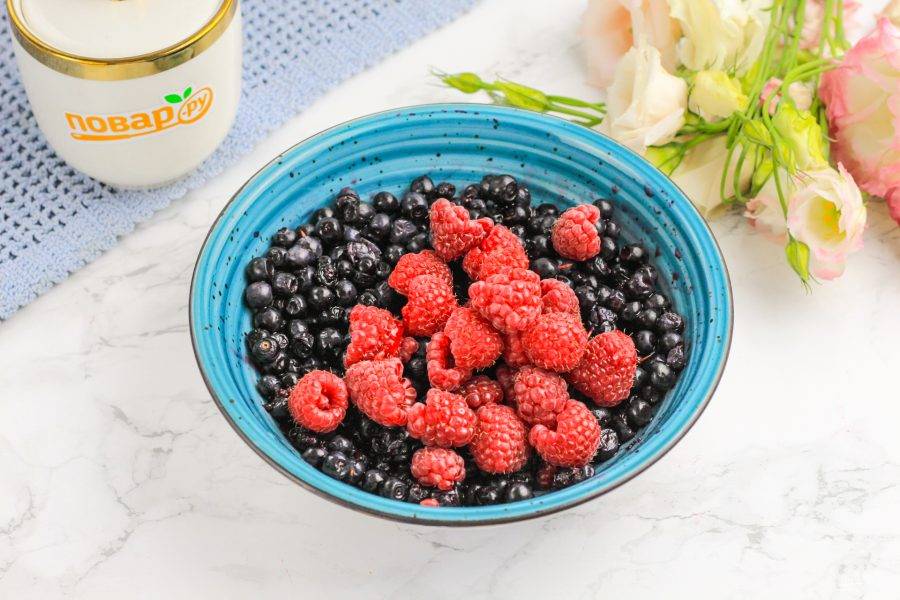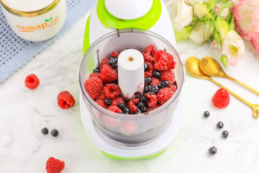 Тщательно измельчите чернику и малину с сахаром в течение 4-5 минут на пульсирующем режиме техники. Очень важно качественно все перемешать.