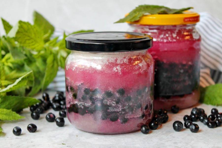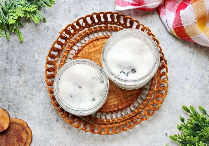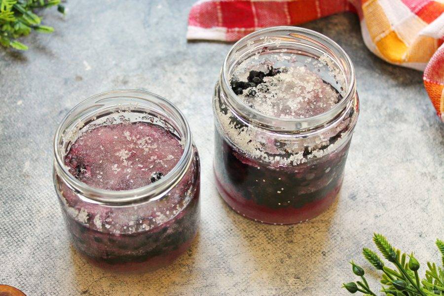 Чередуя слои черники и сахара, заполните банки. Последним слоем должен быть сахар и насыпать его нужно до самого верха.
