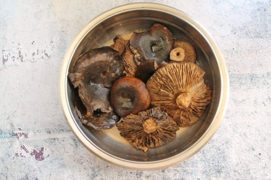 Выложите грузди в глубокую емкость и замочите в холодной воде на три дня. Нужно менять воду дважды в день. Затем промойте грибы и дайте воде стечь.