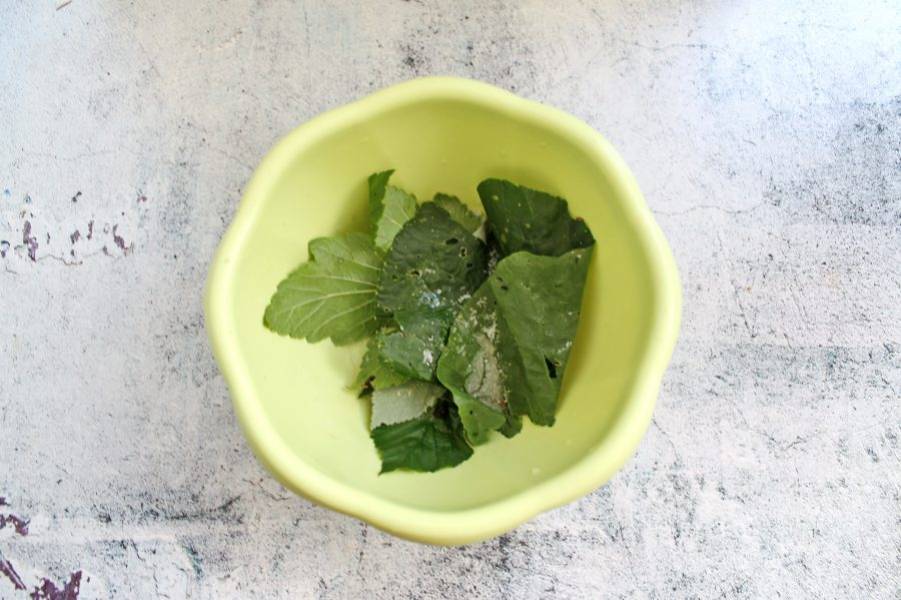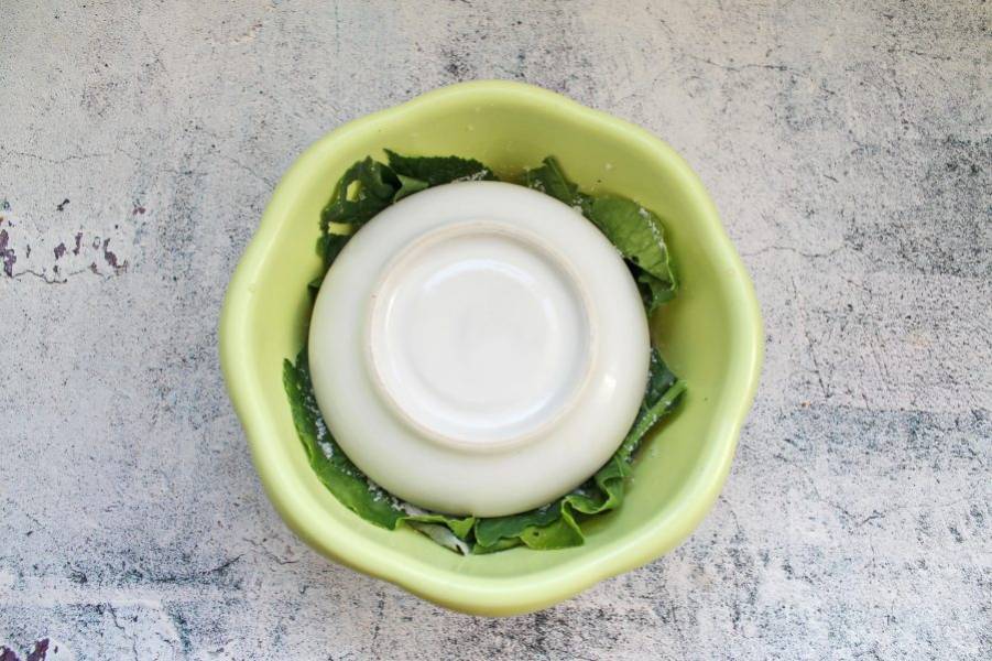 В посуду, где будите солить грузди, выложите часть зелени и насыпьте соль тонким слоем.