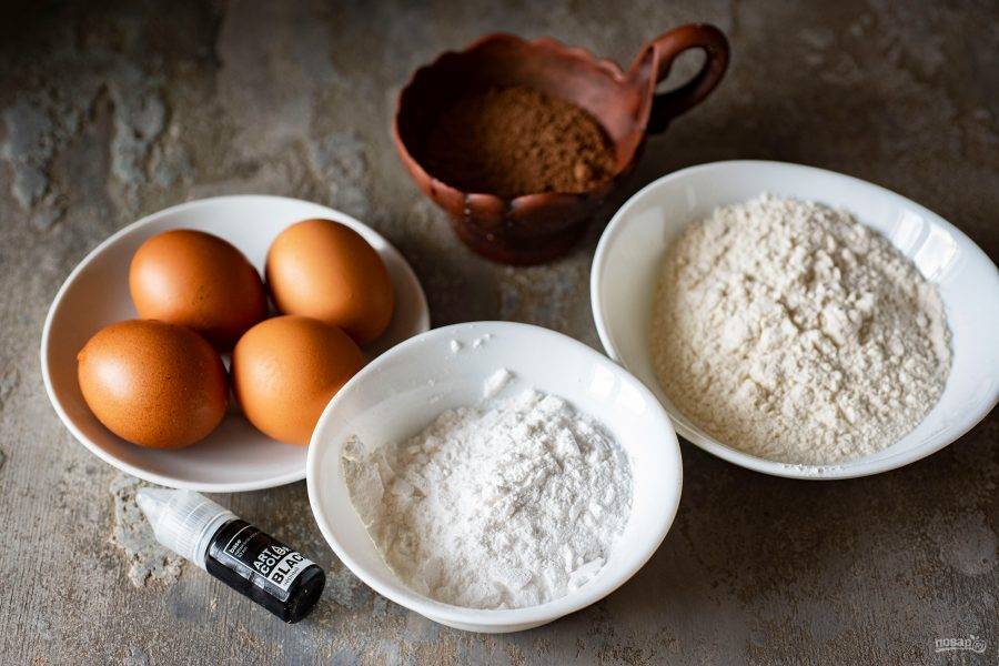 Чтобы бисквит стал черного цвета, в тесто добавим какао и черный гелевый краситель. Количество красителя будет влиять на интенсивность цвета — я добавила 3 капли.