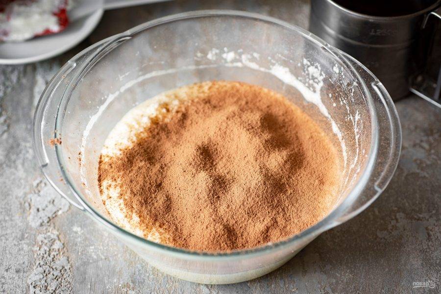 Просейте к яичной смеси какао-порошок.