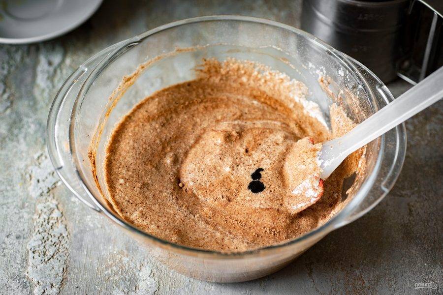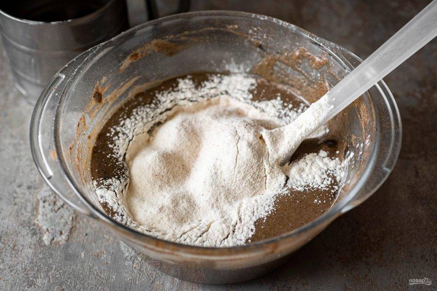 Просейте муку и вмешайте ее до получения однородного, воздушного теста.