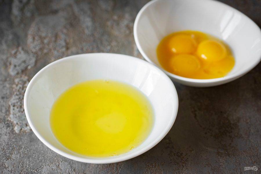 Яйца очень аккуратно поделите на желтки и белки по разным сухим мисочкам.