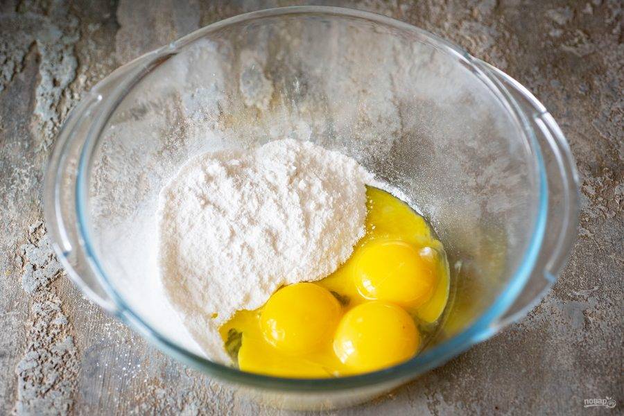 Белковую массу добавьте к желтковой смеси. Вмешайте одну смесь в другую.