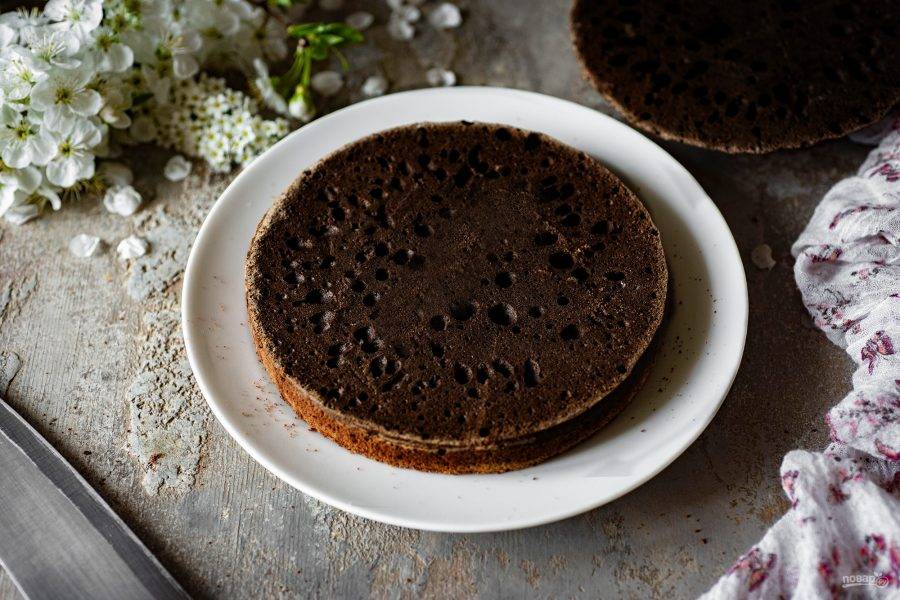 На дно формы выложите пергамент для выпекания и сверху выложите черное бисквитное тесто. Отправьте выпекаться бисквит в уже разогретую до 180 градусов духовку примерно на 25 минут.