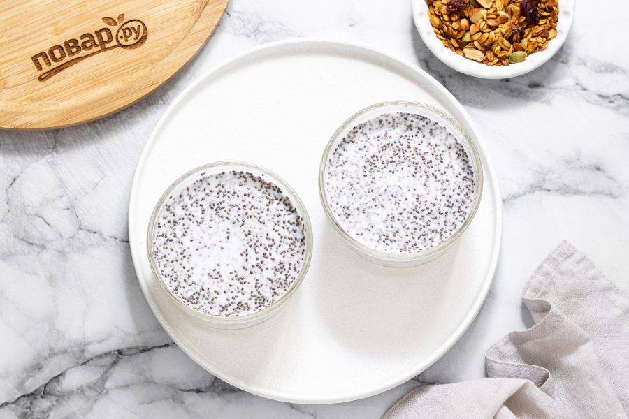 После этого достаньте и еще раз перемешайте, чтобы семена равномерно распределись. Уберите пудинг еще на 1-2 часа, можно оставить на ночь.