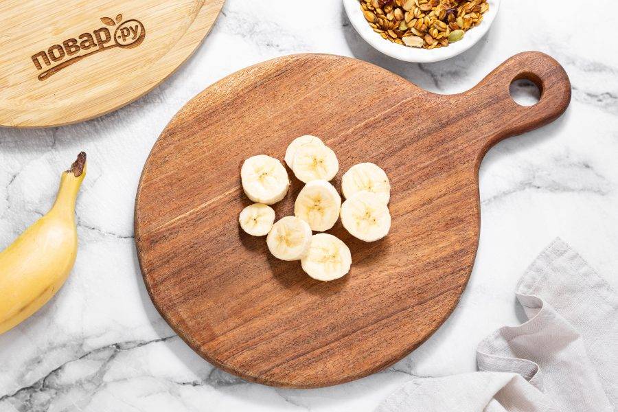Банан очистите и нарежьте кружочками.