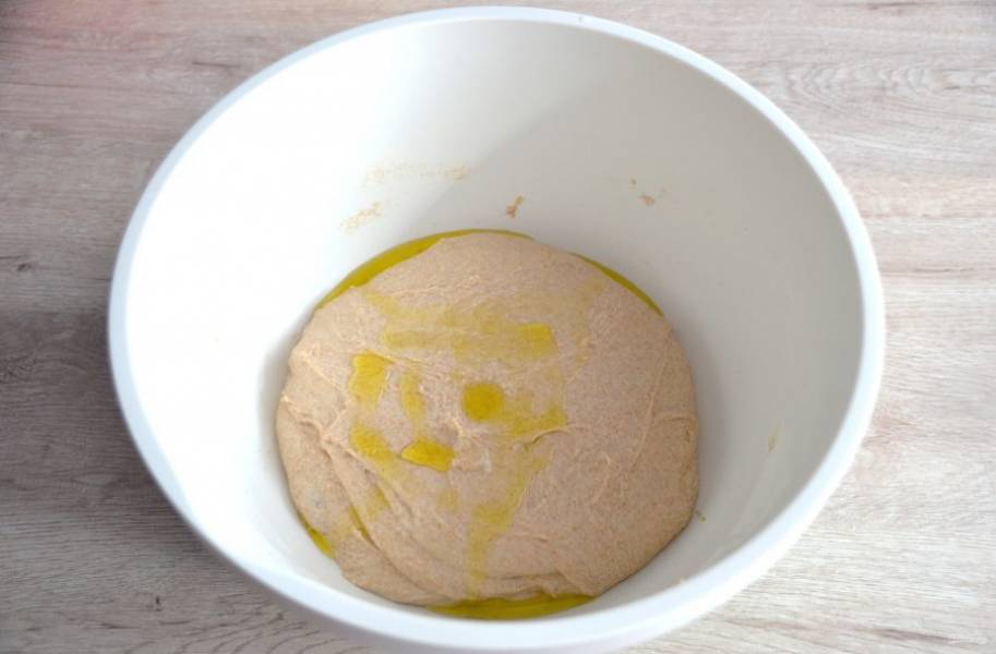 Соберите тесто в шар, накройте крышкой, поставьте для брожения. Каждые 45 минут, трижды, сделайте обминку методом "растянуть и сложить". Во время первой или второй обминки вмешайте в тесто 1,5-2 ст. ложки оливкового масла.