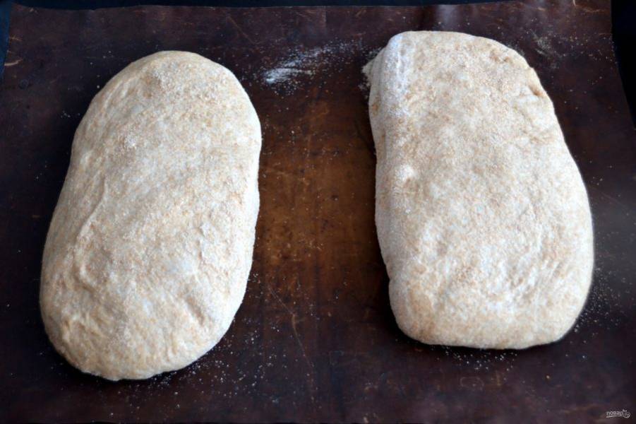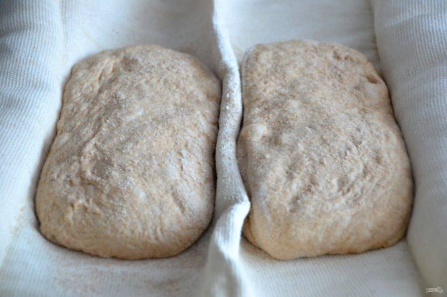 Щедро присыпьте мукой салфетку, выложите на нее заготовки чиабатты, подперев с боков валиками из небольших полотенец, сделав между заготовками складку. Дайте тесту "отдохнуть" 30 минут.