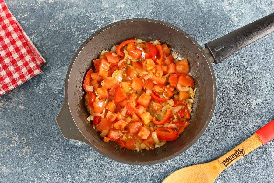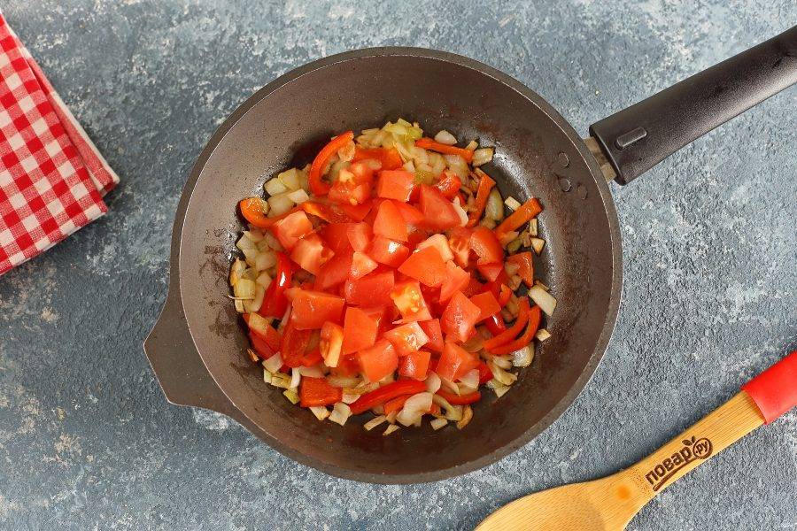 Примерно через пару минут добавьте нарезанные кубиками помидоры.