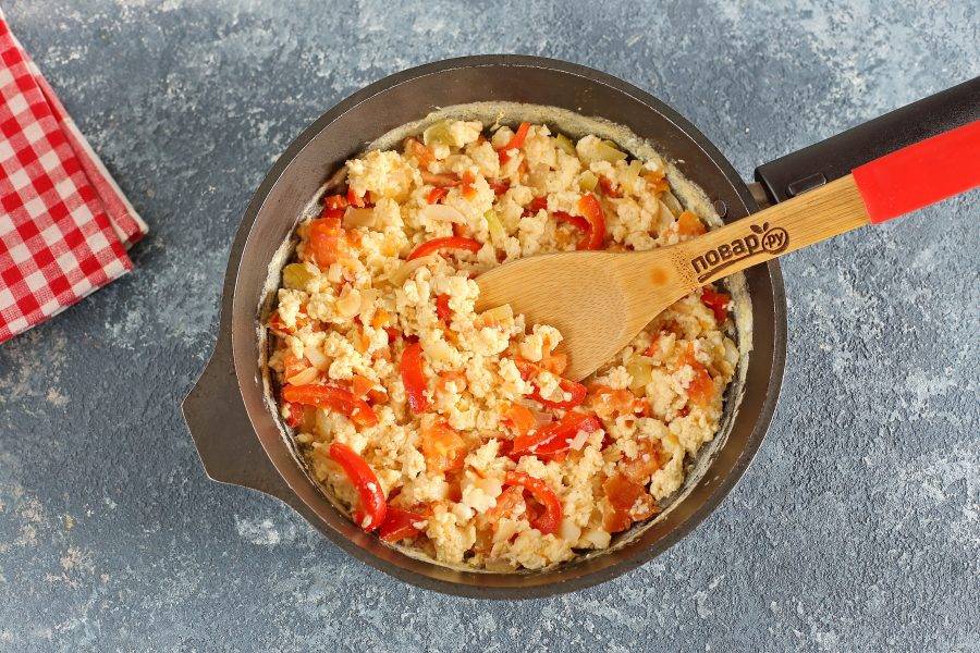 Энергично помешивайте лопаткой, пока не образуются яичные хлопья.