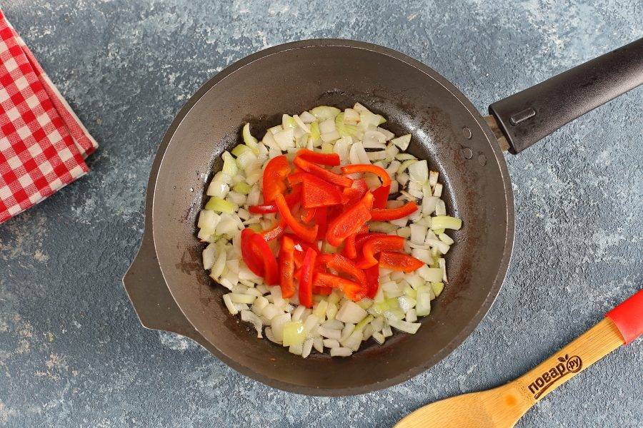 Обжарьте лук до мягкости и добавьте нарезанный соломкой перец.