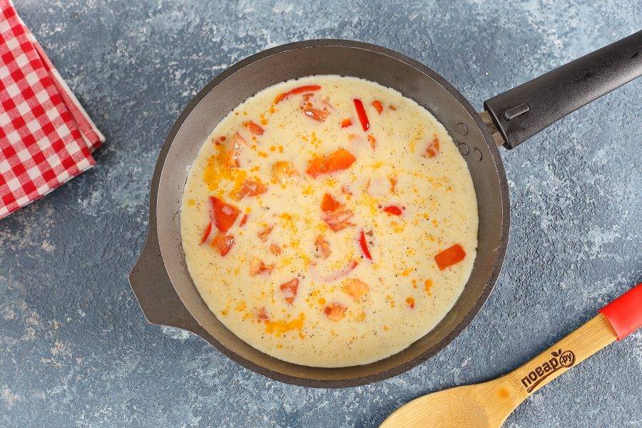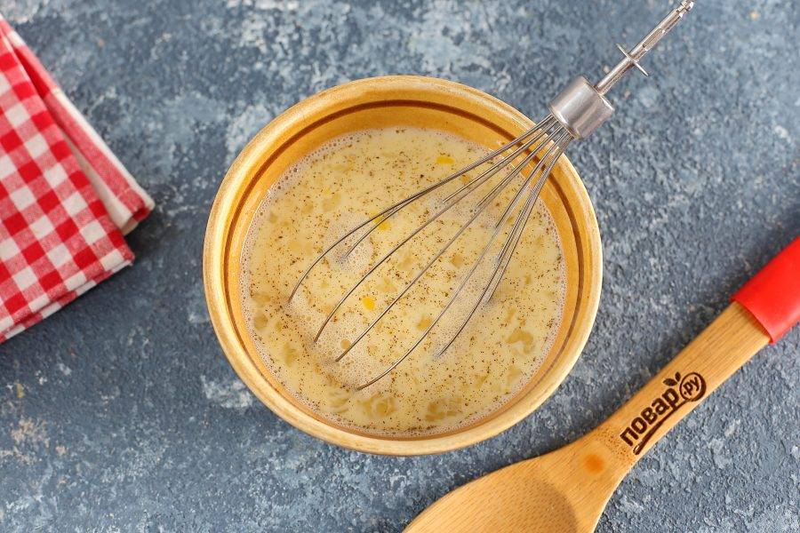 Взбейте яйца с молоком, посолите и добавьте специи.