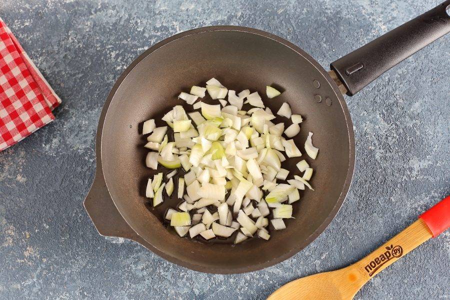 В сковороде разогрейте масло и выложите нарезанный кубиками лук.