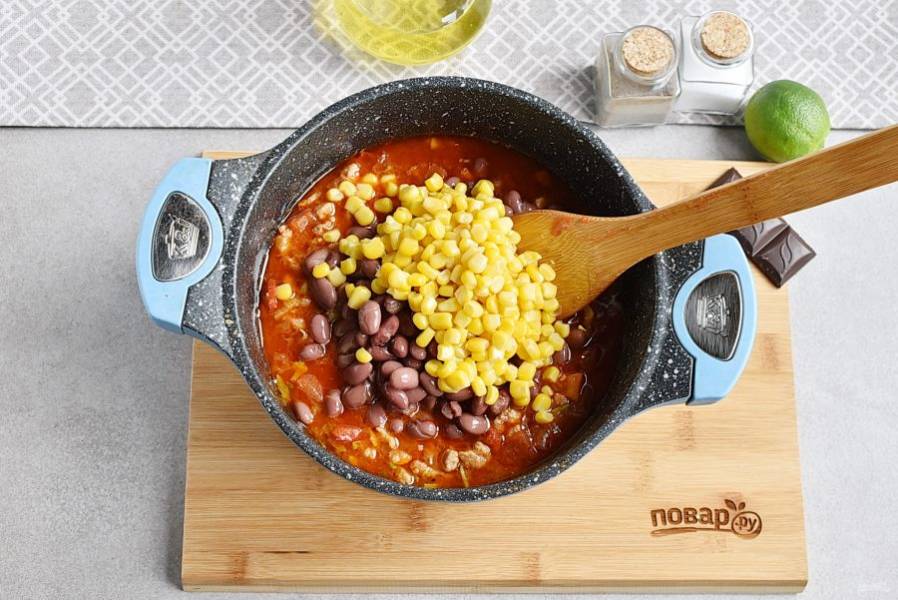 Выложите в жаровню фасоль и кукурузу без заливок. Тушите еще 5 минут.