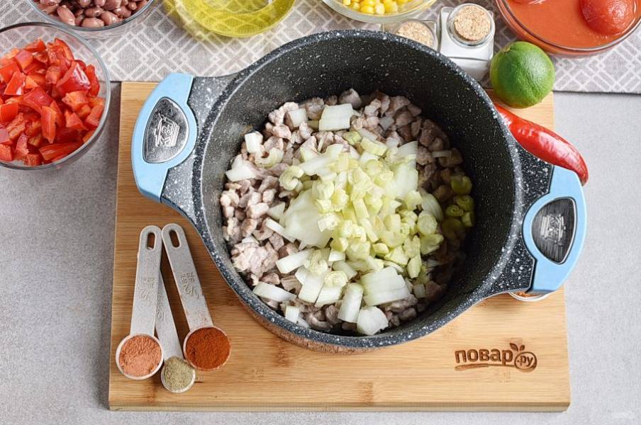 Добавьте лук и сельдерей. Жарьте до позолоты, помешивая.