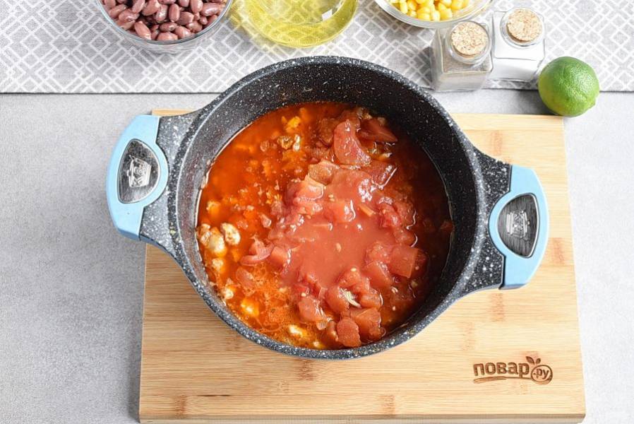 Порубите довольно крупно помидоры и добавьте в кастрюлю вместе с соком. Добавьте бульона или кипятка, чтобы жидкость покрывала мясо на два пальца. Тушите на огне ниже среднего полчаса.