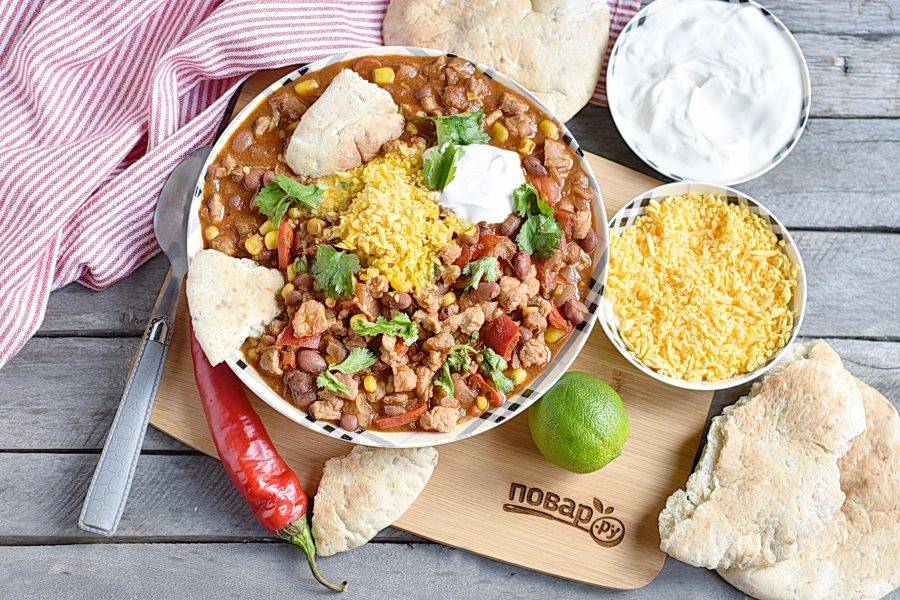 Подавайте "Чили кон карне" горячим, разлив в глубокие миски и дополнив свежими тортильями или лавашем, зеленью кинзы, лаймом, тертым чеддером и сметаной.